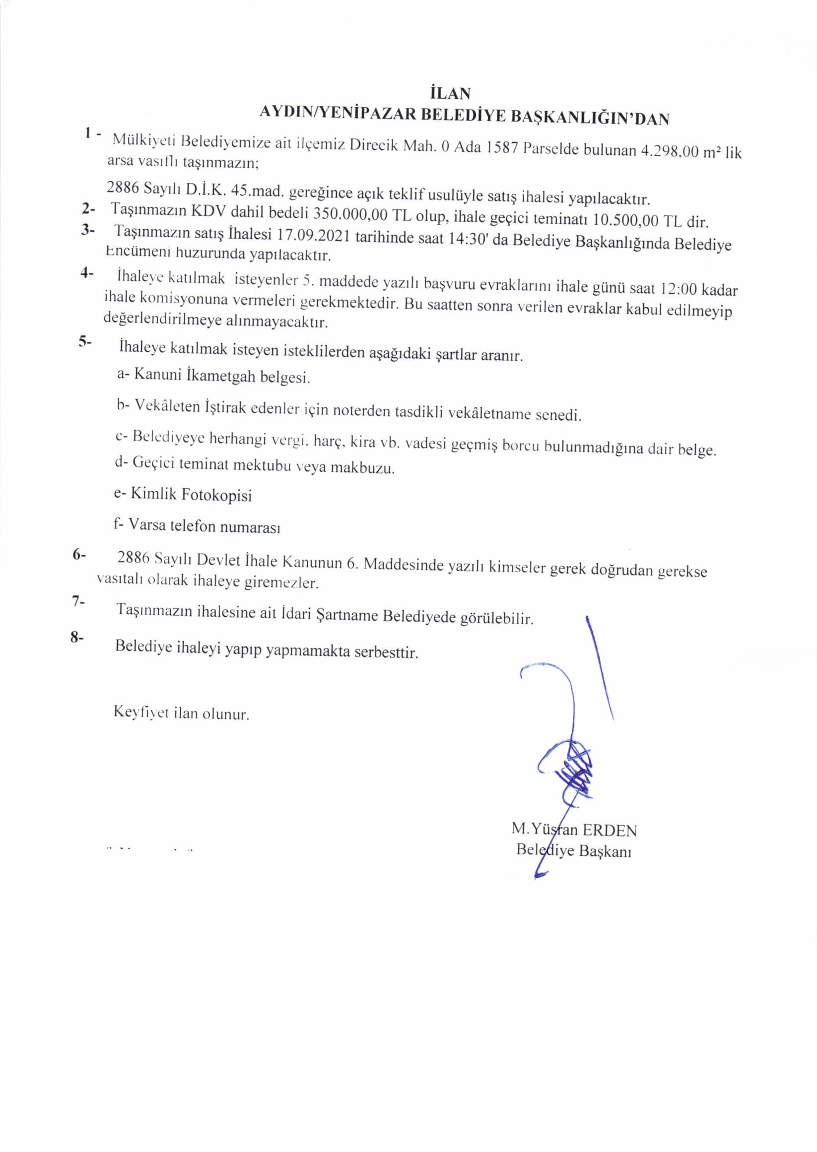 DİRECİK MAH. 0 ADA 1587 PARSEL ARSA SATIŞİHALESİ