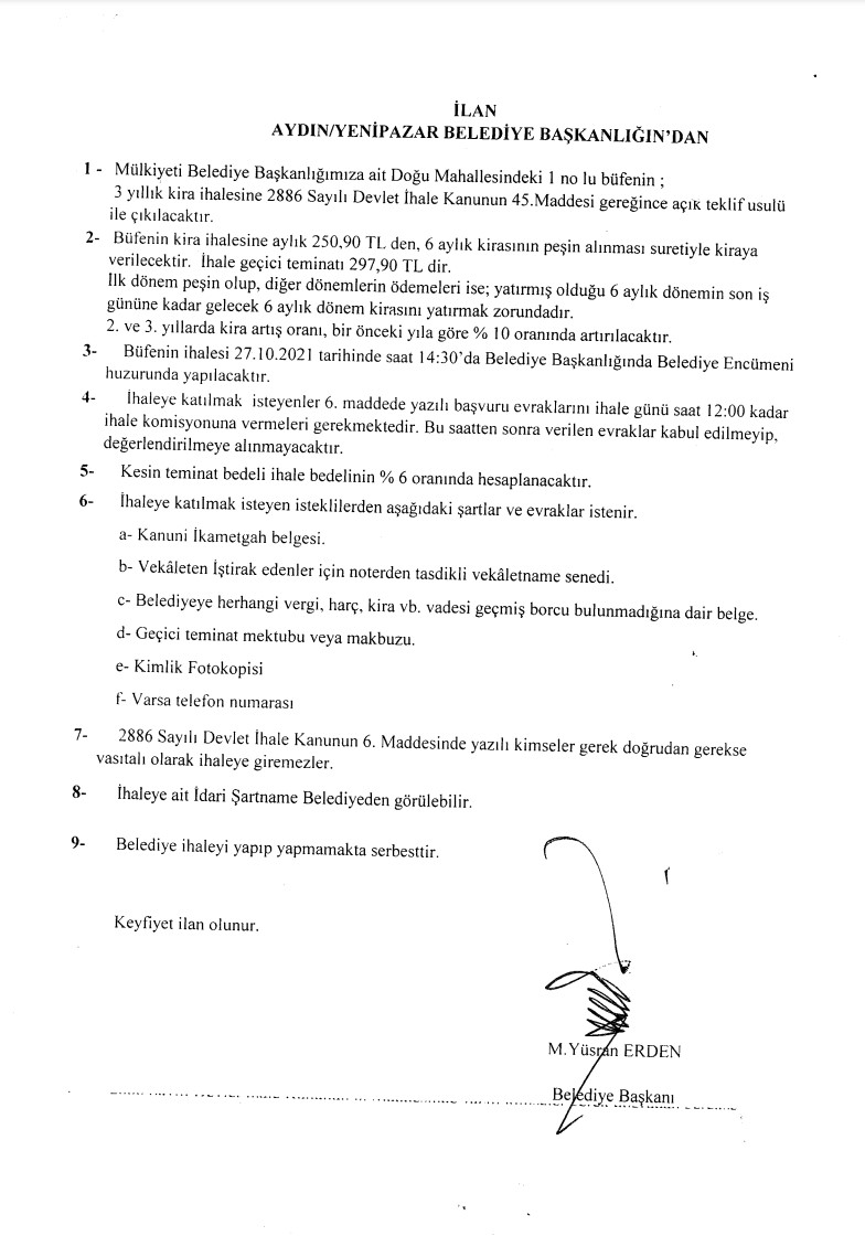 DOĞU MAH. 1 NO’LU BÜFE 3 YILLIK KİRA İHALE DUYURUSU