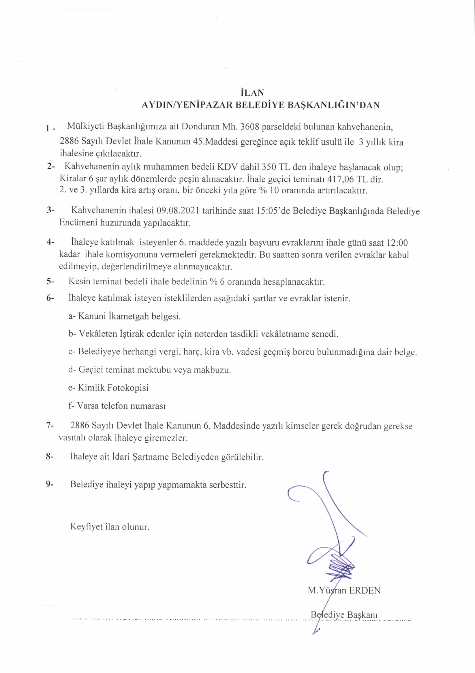 DONDURAN MAH. 3608 PARSEL KAHVENİN KİRA İHALESİ