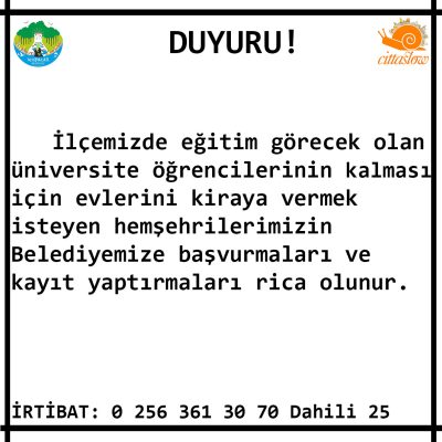 İlçemizde eğitim görecek olan üniversite öğrencilerinin kalması için evlerini kiraya vermek isteyen hemşehrilerimizin Belediyemize başvurmaları...