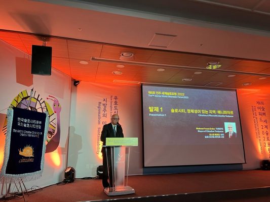 Kore’de 27 Ekim 2022 günü düzenlenen uluslararası CİTTASLOW toplantısında Türkiye adına bir sunum yapan Belediye...